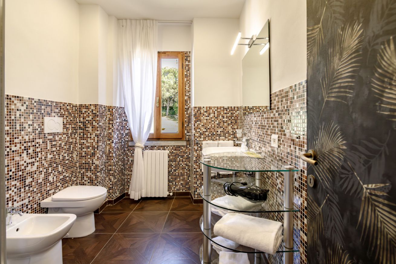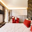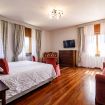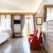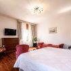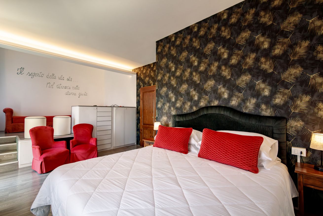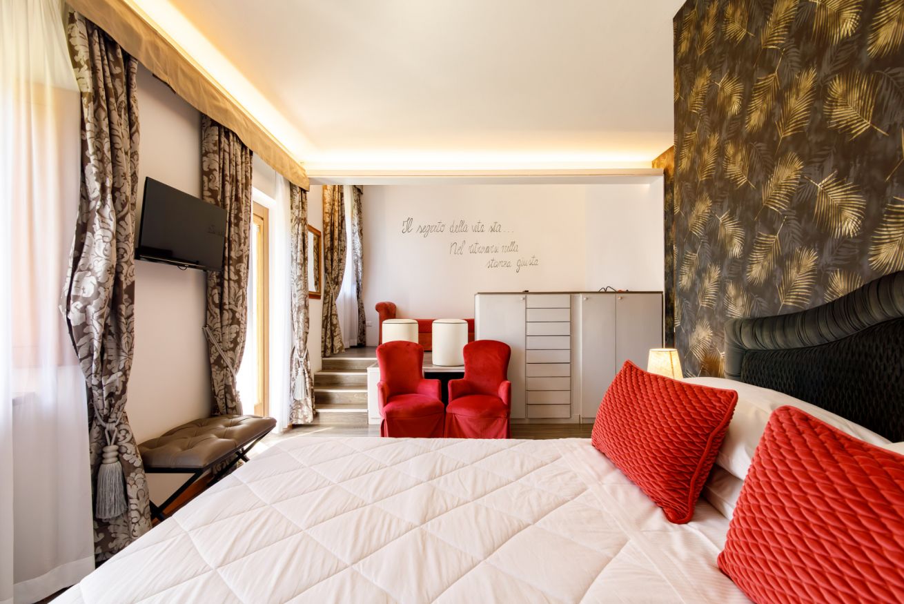 La 'Suite' di 35 mq è così composta: un letto matrimoniale king size, possibilità di aggiunta di 2 letti singoli e un ampio bagno in marmo, privato completo e finestrato con vasca/doccia.